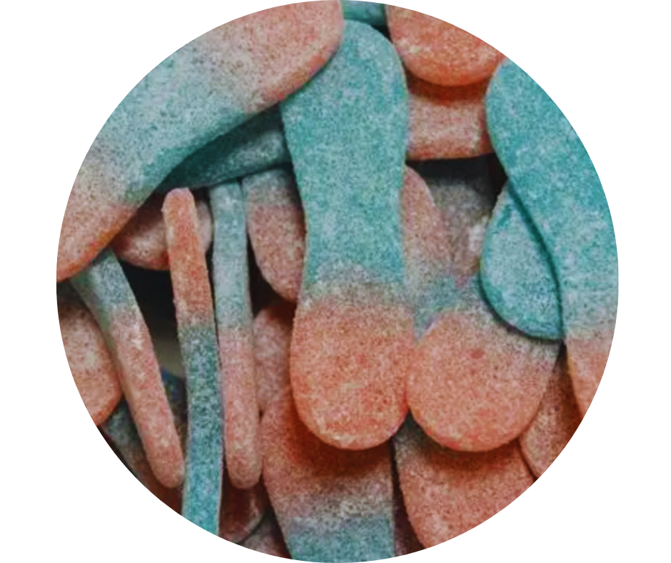 Ingrédients : Sucre, amidon, sirop de glucose, eau, acidifiant (E330, E334), arômes, colorants (E120, E161b, E133).
