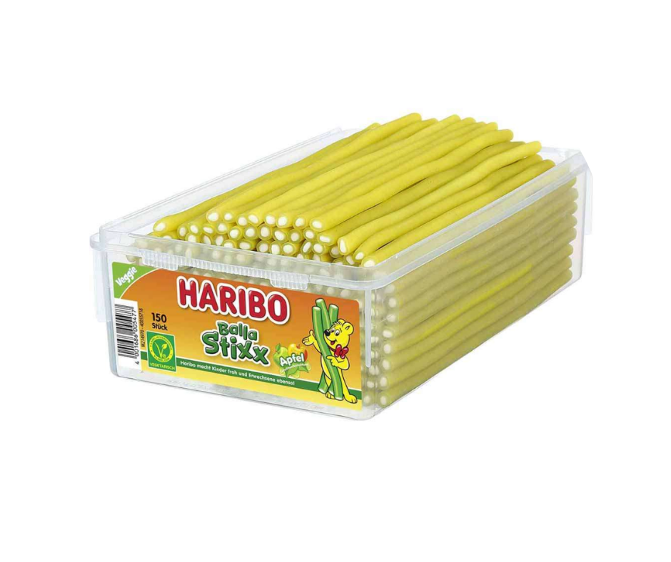 Confiserie de gomme aux fruits au goût de pomme. La spécialité espagnole populaire HARIBO Balla Stixx sont des bâtonnets de confiserie aux fruits aromatiques au délicieux goût de pomme .