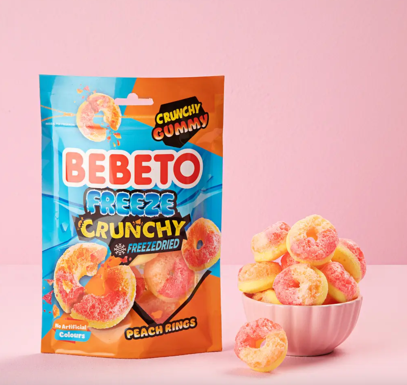 Les Bebeto Freeze Crunchy Peach Rings réinventent le célèbre anneau pêche en version lyophilisée et croquante. Un bonbon aérien, croustillant à souhait, qui explose de saveur dès la première bouchée !