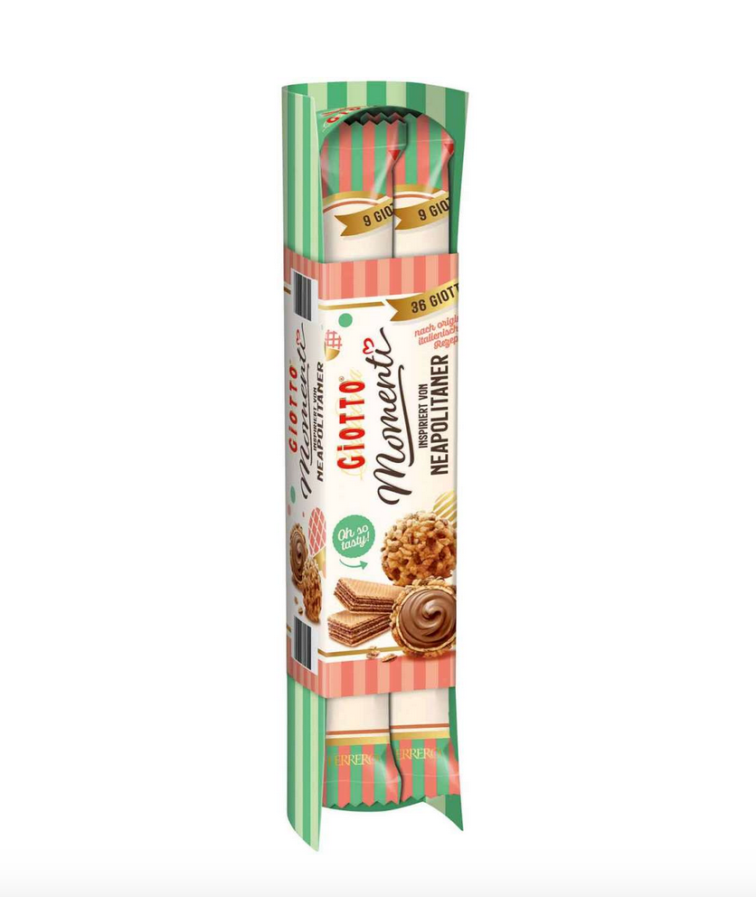 Les Giotto Momenti Napolitains sont de délicates mini-boules de biscuit qui allient croustillant et fondant à la perfection. Leur coque dorée en gaufrette renferme un cœur irrésistiblement crémeux aux noisettes, offrant une explosion de saveurs à chaque bouchée. Inspirées des célèbres gaufres napolitaines, ces gourmandises éveillent immédiatement l’envie d’y revenir. Leur texture unique, mêlant gaufrette légère et éclats de biscuit croquants, transforme chaque instant en un pur moment de plaisir.