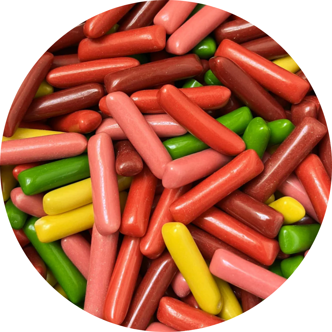 Petits et doux bâtonnets dragéifiés, lisses, d'une longueur de 2,5cm. Légèrement croquants au début au bon goût de Fruits!