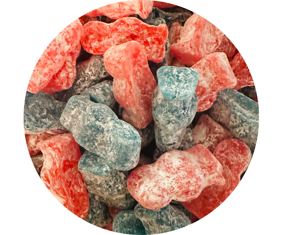 Ingrédients : Sucre, sirop de glucose (de blé), eau, gélatine de bœuf, acide citrique, arômes, colorants : E129*, E124*, E131 ; amidon de maïs