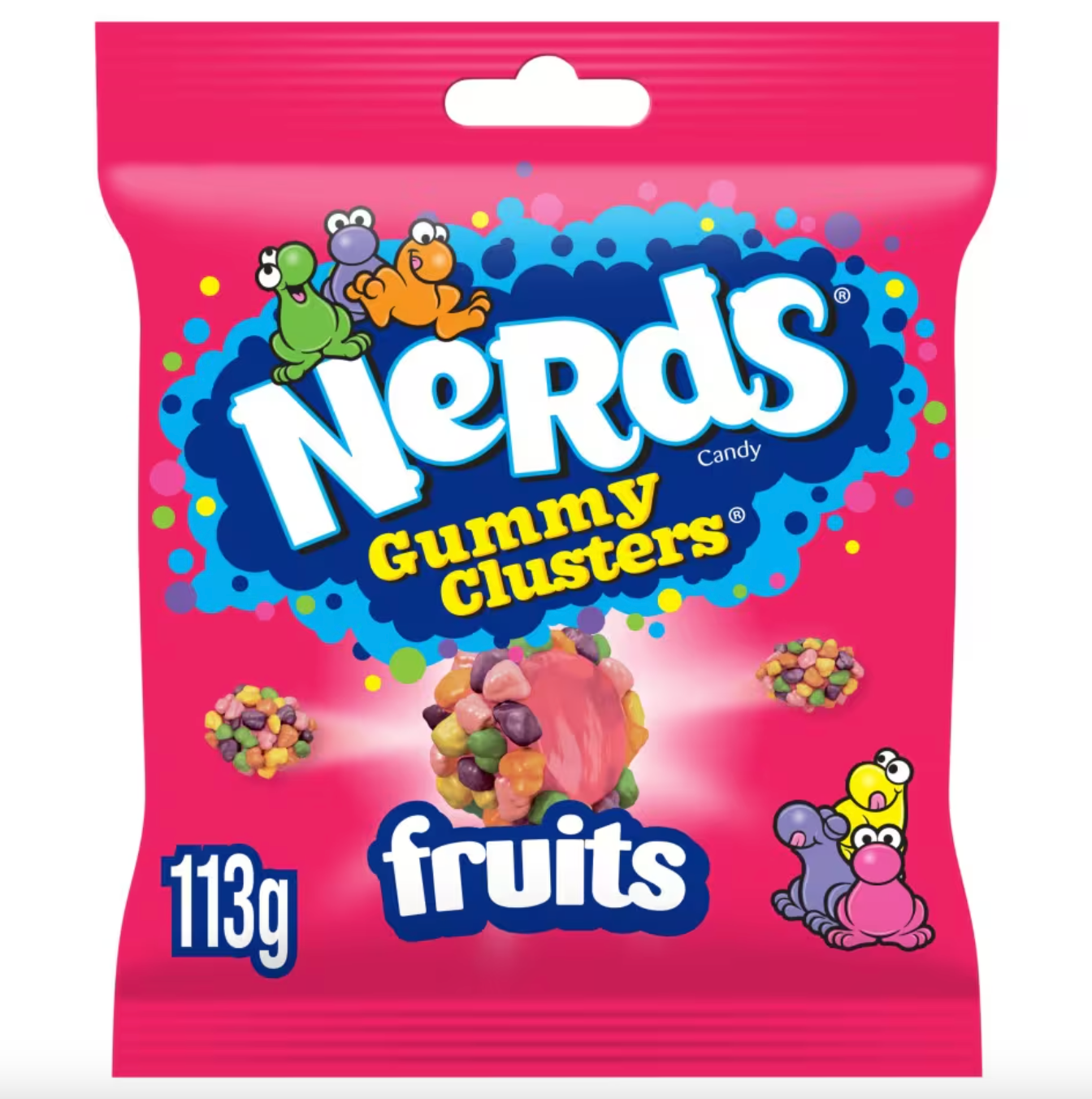 Ingrédients : Sirop de maïs, sucre, dextrose, gélatine, amidon de maïs modifié, eau, contient à 2% ou moins acidifiants (acide malique, acide citrique, citrate de sodium), concentré de jus de pomme, arômes naturels et artificiels, épaississants (E414), agent d'enrobage (E903), colorants (E129*, E102*, E133, E110*), concentré de jus de pastèque.
