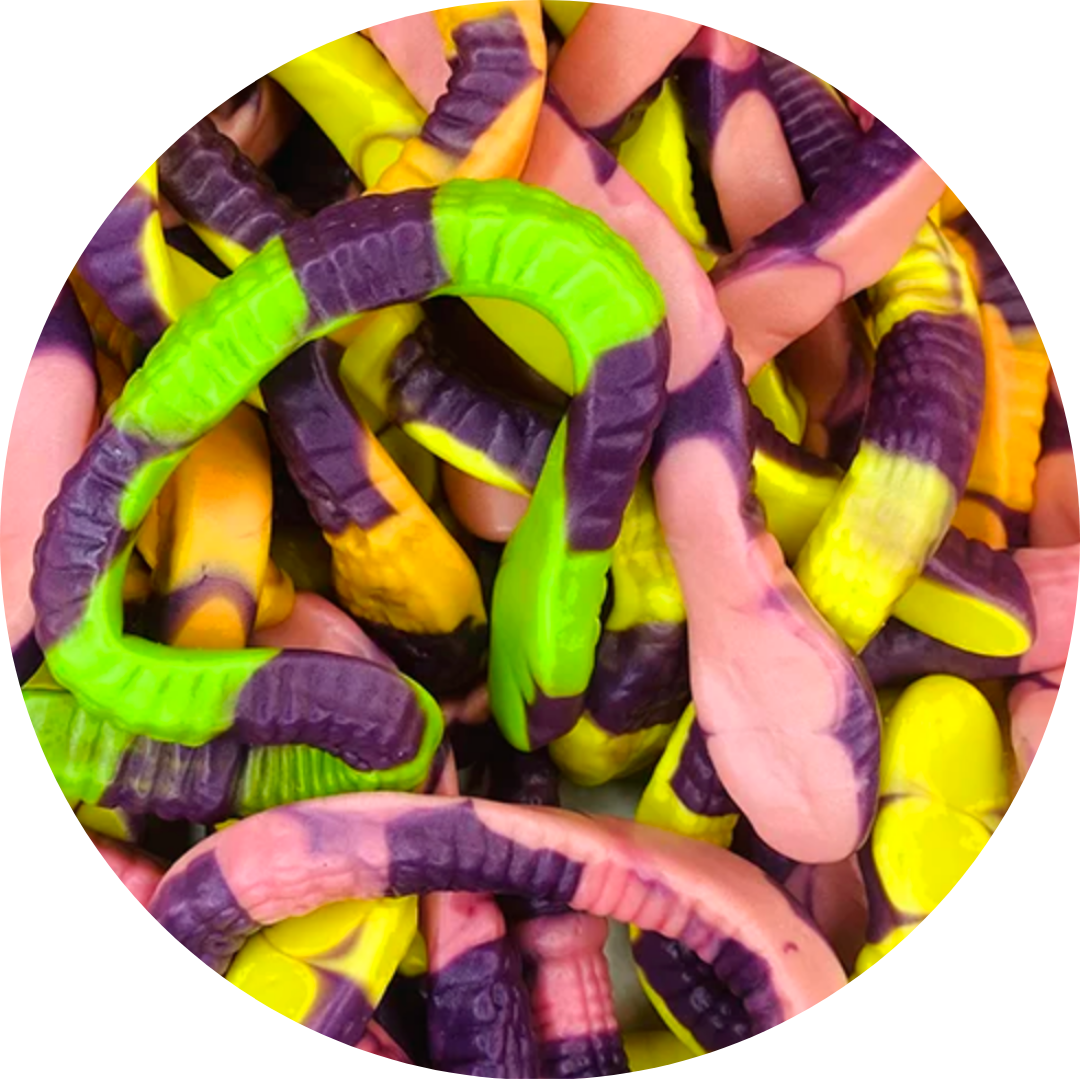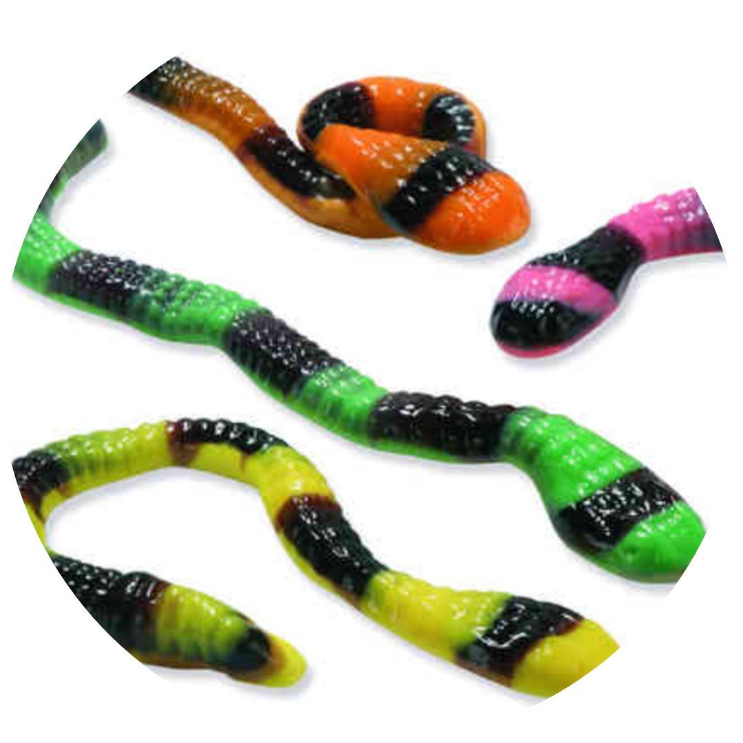 Découvrez nos serpents anaconda XXL en bonbon, gélifiés et lisses, et offrant un mélange de saveurs de citron, orange, fraise et pomme. Qui aura le courage de les mordre en premier ?