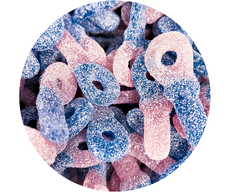 Ingrédients : sucre, sirop de glucose, amidon de BLÉ, eau, amidon de maïs modifié, acidifiants [E270, E296, E330, E350], amidon de pomme de terre modifié, correcteur d'acidité [EE500], arôme, colorant [E133], concentré de jus de carotte noire.