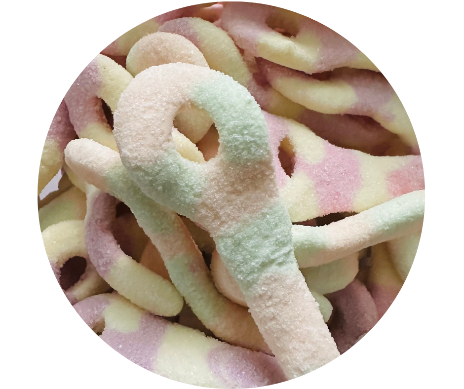 Ingrédients : sucre, sirop de glucose, sirop de glucose-fructose, gélatine, acidulant (E270), arômes, colorants (E104, E110, E122, E131), AMIDON DE BLÉ modifié