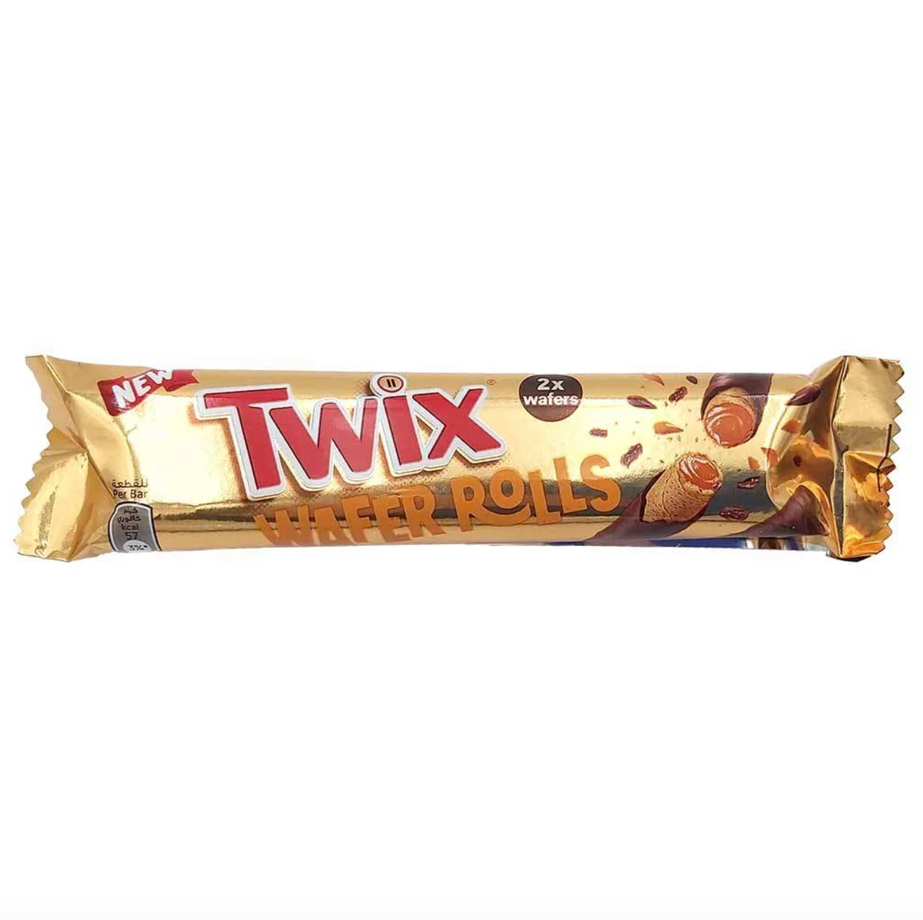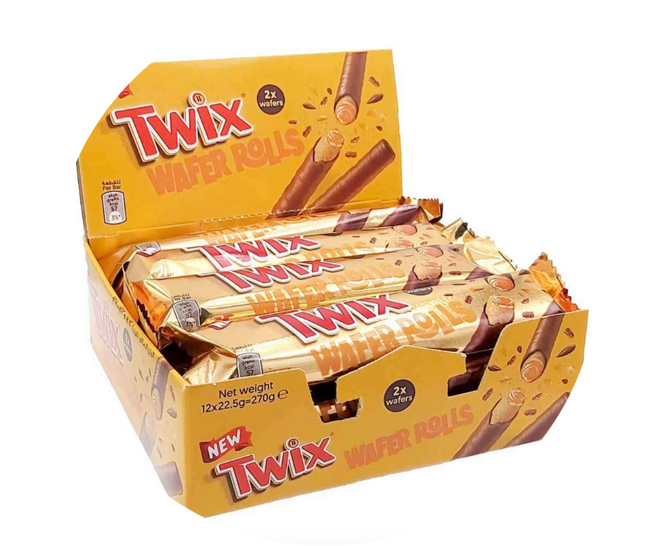 Gaufrette Twix roulées croustillantes (25%) fourrée à la crème au caramel (46%) enrobée de chocolat au lait (29%). 12 rouleaux doubles en présentoir de comptoir.